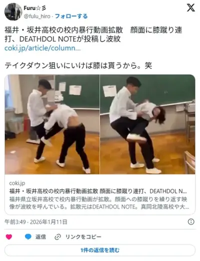 【福井】坂井高校の校内暴行動画拡散 顔面に膝蹴り連打