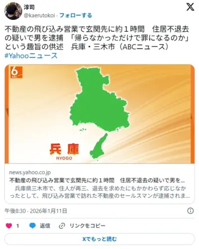 「帰らなかっただけで罪になるのか」飛び込み営業で玄関先に約1時間 住居不退去の疑いで男を逮捕