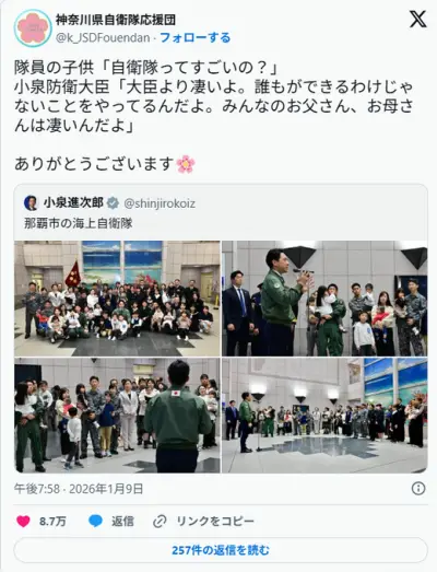 小泉防相、自衛隊員の子供達に「みんなのお父さん、お母さんは大臣よりすごい」と言い伝える