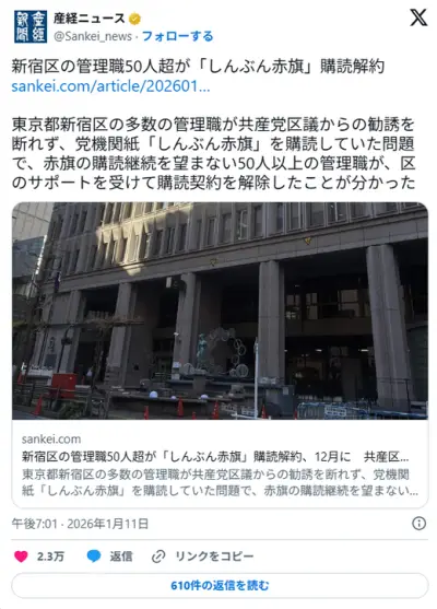 新宿区の管理職50人超が「しんぶん赤旗」購読解約、12月に 共産区議の勧誘断れずか - 産経