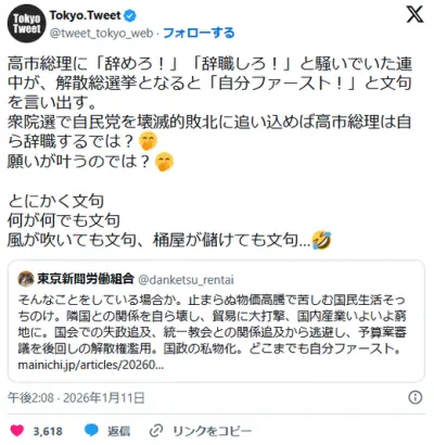 東京新聞労組「高市辞めろ」「辞職しろ」 →「解散なんぞしている場合か!」