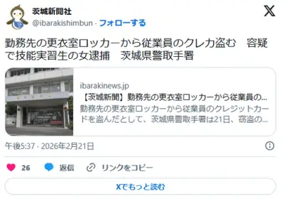【茨城】ベトナム人技能実習生の女を逮捕 勤務先で同僚のクレジットカードを盗む