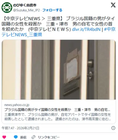 【三重】ブラジル国籍の男を逮捕 タイ人女性を絞殺か