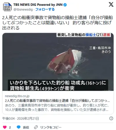 13人が海に投げ出される…貨物船で遊漁船に衝突し男性2人を死亡させた疑い 航海士の21歳女を逮捕