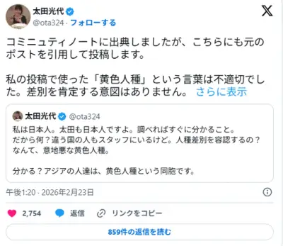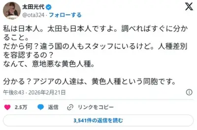 太田光代氏、「黄色人種」表現のポストを反省 「差別を肯定する意図はありません」