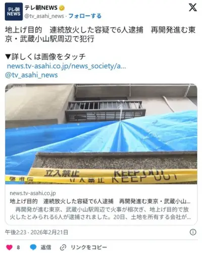 放火実行犯「100万円の報酬をもらった」東京・武蔵小山地上げ目的連続放火事件で6人逮捕