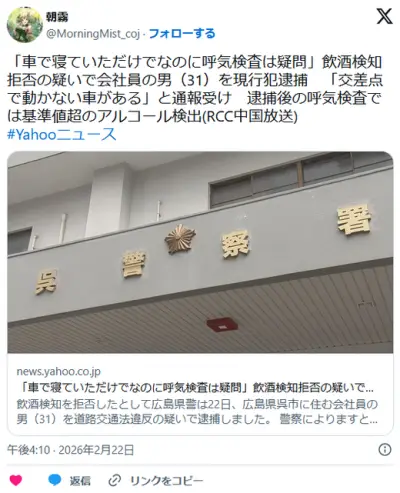 「交差点で動かない車がある」飲酒検知を求められるも拒否「車で寝ていただけでなのに呼気検査は疑問」会社員の男(31)を現行犯逮捕