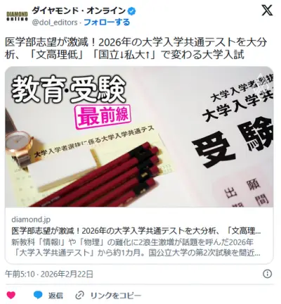 【進路】医学部志望が激減!2026年の大学入学共通テストを大分析、「文高理低」「国立↓私大↑」で変わる大学入試