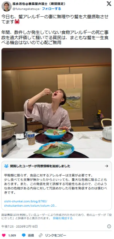 福永弁護士、蟹アレルギーの妻に「無理やり食べさせ続けた結果、蟹が大好きになった」投稿が炎上 批判に「うるせーよ」