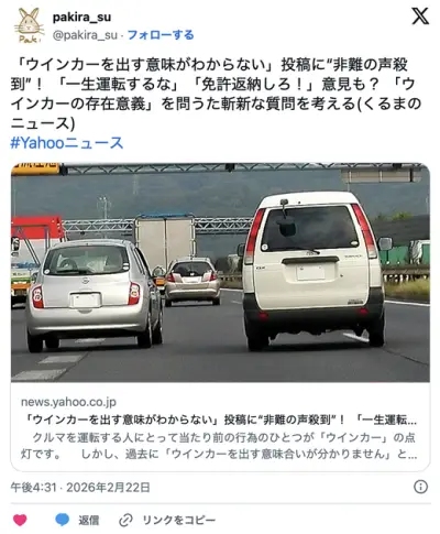 「ウインカーを出す意味がわからない」投稿に非難の声殺到! 「一生運転するな」「免許返納しろ!」