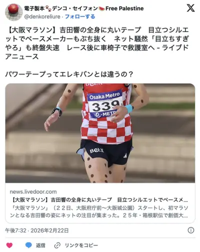 【大阪マラソン】全身にテープを貼って臨んだ選手、前半快調も後半失速 効果あるの?これ(´・ω・`)