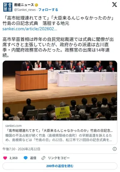 「高市総理連れてきて」「大臣来るんじゃなかったのか」竹島の日記念式典 落胆する地元