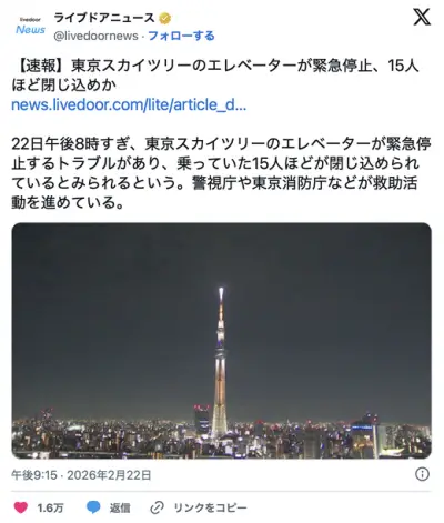 スカイツリーエレベーター 急降下し非常停止 展望室に取り残された観覧客も
