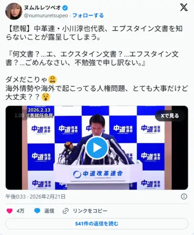 中革連・小川淳也代表「エ、エクスタイン文書?…エフスタイン文書?なんですかそれ?」