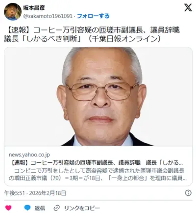 【千葉】コンビニでコーヒー万引容疑の匝瑳市副議長、議員辞職 議長「しかるべき判断」