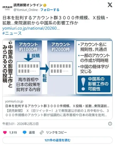 【X】高市首相や日本を批判するアカウント群3000件規模、投稿・拡散…衆院選前から中国系の影響工作か