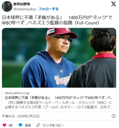 【WBC】ベネズエラ監督、日本球界に不満「矛盾がある」…1400万円が“ネック”でWBC呼べず