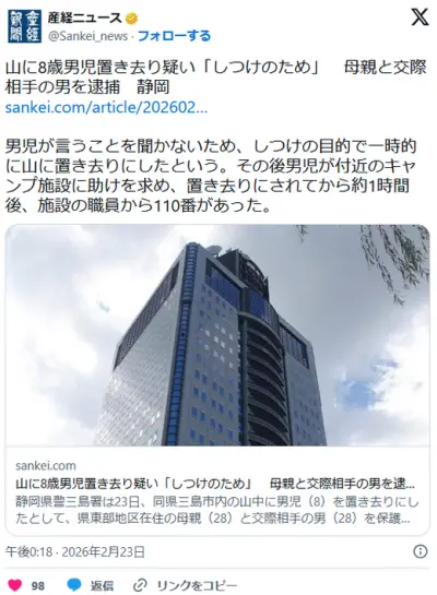 山に8歳男児置き去り疑い「しつけのため」 母親と交際相手の男を逮捕 静岡