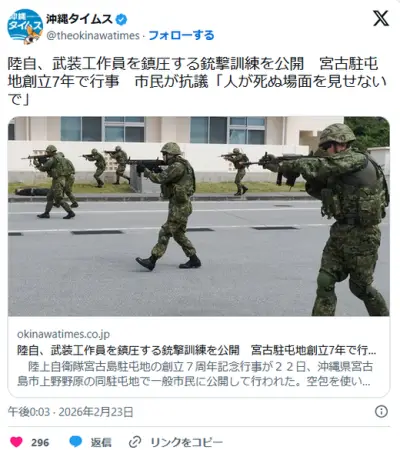 陸自、武装工作員を鎮圧する銃撃訓練を公開 宮古駐屯地創立7年で行事 市民が抗議「人が死ぬ場面を見せないで」 | 沖縄タイムス