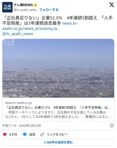 「正社員足りない」企業52.3% 4年連続5割超え 「人手不足倒産」は3年連続過去最多