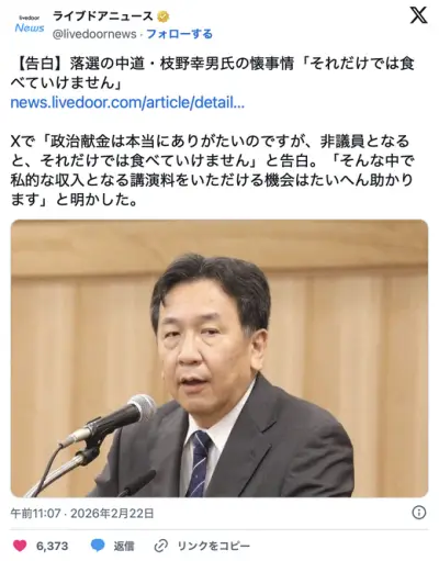 落選枝野 生活に困っていると唐突に被害者面をし始める