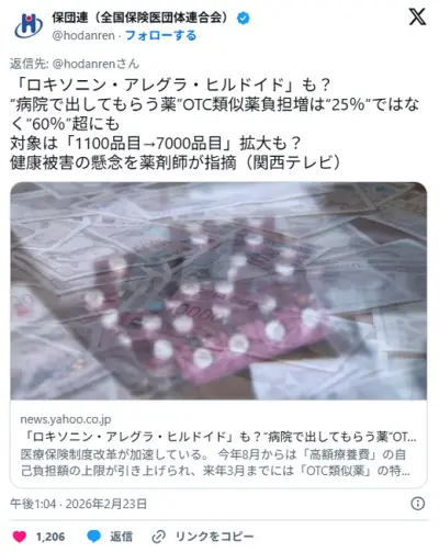 「ロキソニン・アレグラ・ヒルドイド」 病院で出してもらうOTC類似薬負担増 25%ではなく60%超にも 「1100品目→7000品目」拡大も