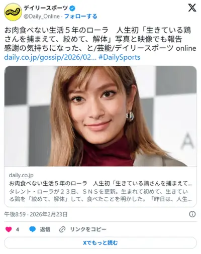 【芸能】ローラ、お肉食べない生活5年 人生初「生きている鶏さんを捕まえて、絞めて、解体」 写真と映像でも報告 感謝の気持ち