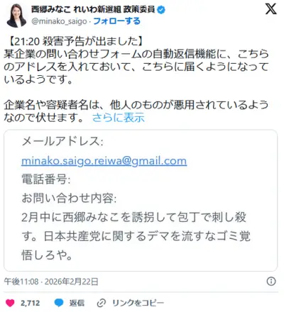 日本共産党員、れいわ新選組の女性候補に殺害予告