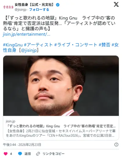 【音楽】King Gnu井口理 ライブ中の“客の熱唱”肯定でファン猛反発「ずっと歌われるの地獄」「アーティストが認めているなら」賛否の声