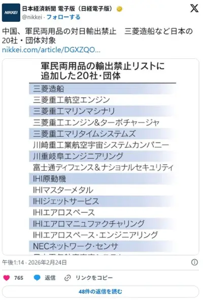 【速報】中国、三菱重工を含む日本企業20社を輸出禁止措置→株価大暴落