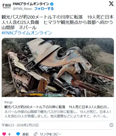 ネパールの山岳バスが転落し19人死亡 日本人含む25人負傷