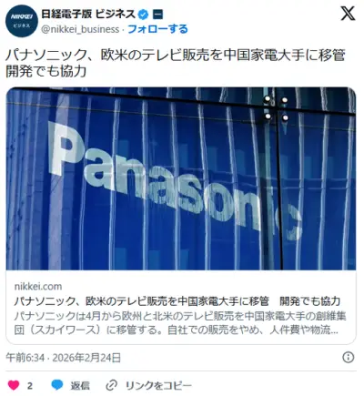 パナソニック、欧米のテレビ販売を中国家電大手に移管 開発でも協力