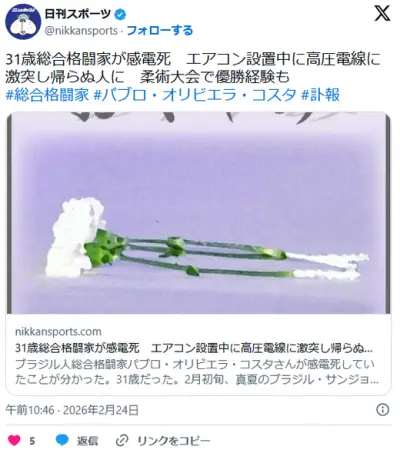 【訃報】ブラジル人総合格闘家パブロ・オリビエラ・コスタさん(31)が感電死 エアコン設置中に高圧電線に激突 柔術大会で優勝経験も