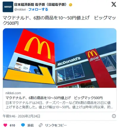【悲報】マクドナルド、6割の商品を10~50円値上げ ビッグマック500円 25日から
