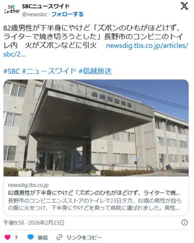 82歳男性が下半身にやけど「ズボンのひもがほどけず、ライターで焼き切ろうとした」長野市のコンビニのトイレ内 火がズボンなどに引火
