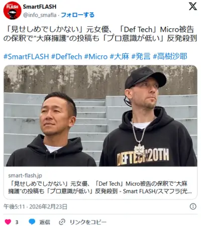 元女優・高樹沙耶 『Def Tech』Micro被告の大麻所持逮捕を擁護 「見せしめでしかない」「使い方次第では人類と寄り添える物」