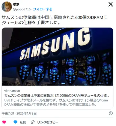 サムスンの最先端メモリ製造法、中国に漏洩、技術者が丸暗記し「手書きの紙」で売り渡し😲