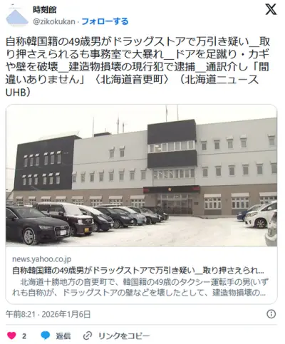 【北海道】自称韓国籍49歳男がドラッグストアで万引き疑い 取り押さえられるも事務室で大暴れドアを足蹴りカギや壁を破壊し逮捕