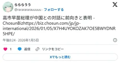 【速報】高市「中国さんごめんなさい。やっぱり話し合いたいです。私たち関係をやり直せませんか?」