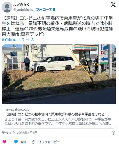 【大阪】コンビニの駐車場内で乗用車が15歳の男子中学生をはねる 意識不明の重体・心肺停止 運転の70代男を逮捕