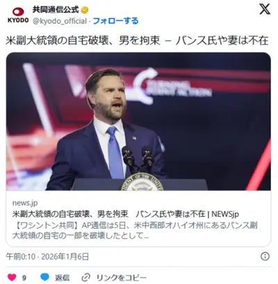 米副大統領の自宅破壊、男を拘束 バンス氏や妻は不在
