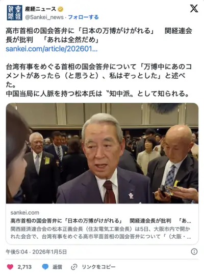 高市、ついに財界からノーを突きつけられる。「アレはもうダメだ。万博中だったらと思うとゾッとする」