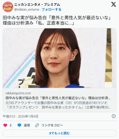 田中みな実(39)「ここ最近『私って意外と男性から人気無い?』と感じる。『何か怖い』と思われてる」