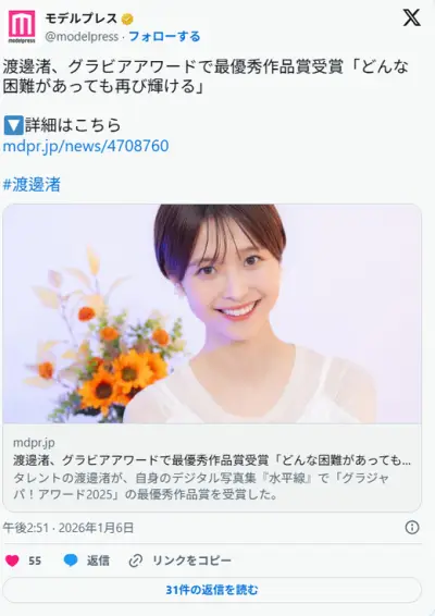 渡邊渚、グラビアアワードで最優秀作品賞受賞「どんな困難があっても再び輝ける」「グラビアを通じて自分に自信を持てるようになった」