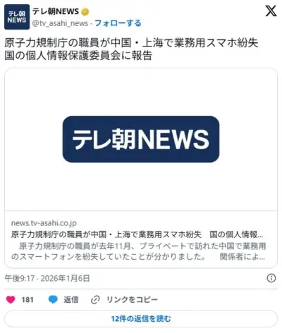 中国観光に行った原子力規制庁の職員、業務用のスマートフォンを中国にて紛失