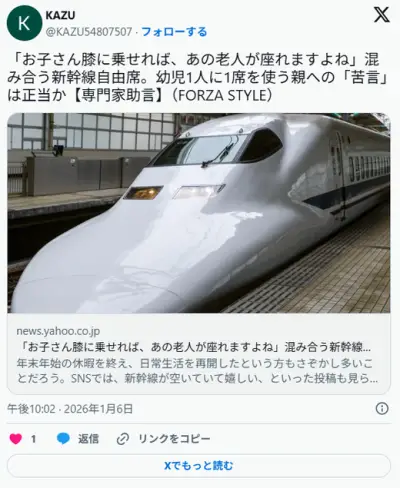 【お子さん膝に乗せれば一人座れますよね】混み合う新幹線自由席で幼児1人に1席を使う親に苦言へ