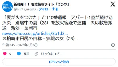 【新潟】「妻が火をつけた」と110番通報 アパート1室焼ける火災で別居中の妻(28)を放火容疑で現行犯逮捕 夫は煙を吸い搬送 長岡市