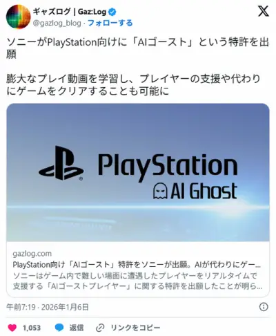 【ソニー】PS向けに『AIゴースト』特許を出願、学習データを元にAIが勝手にゲームをクリアする機能