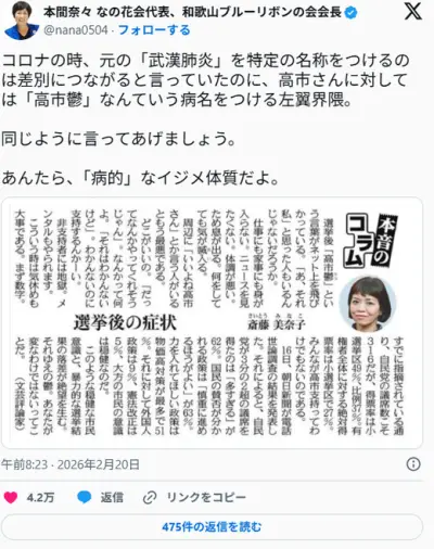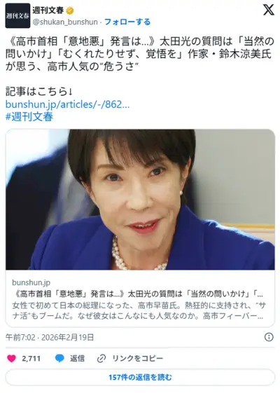 文春「高市総理は女性の味方ではない、ごく一部のネトウヨに受けているだけ、大変危険」