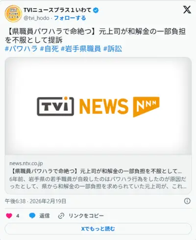 県職員が自殺→県が和解し1億支払い→パワハラ上司が責任を否定し負担分2000万支払い拒絶